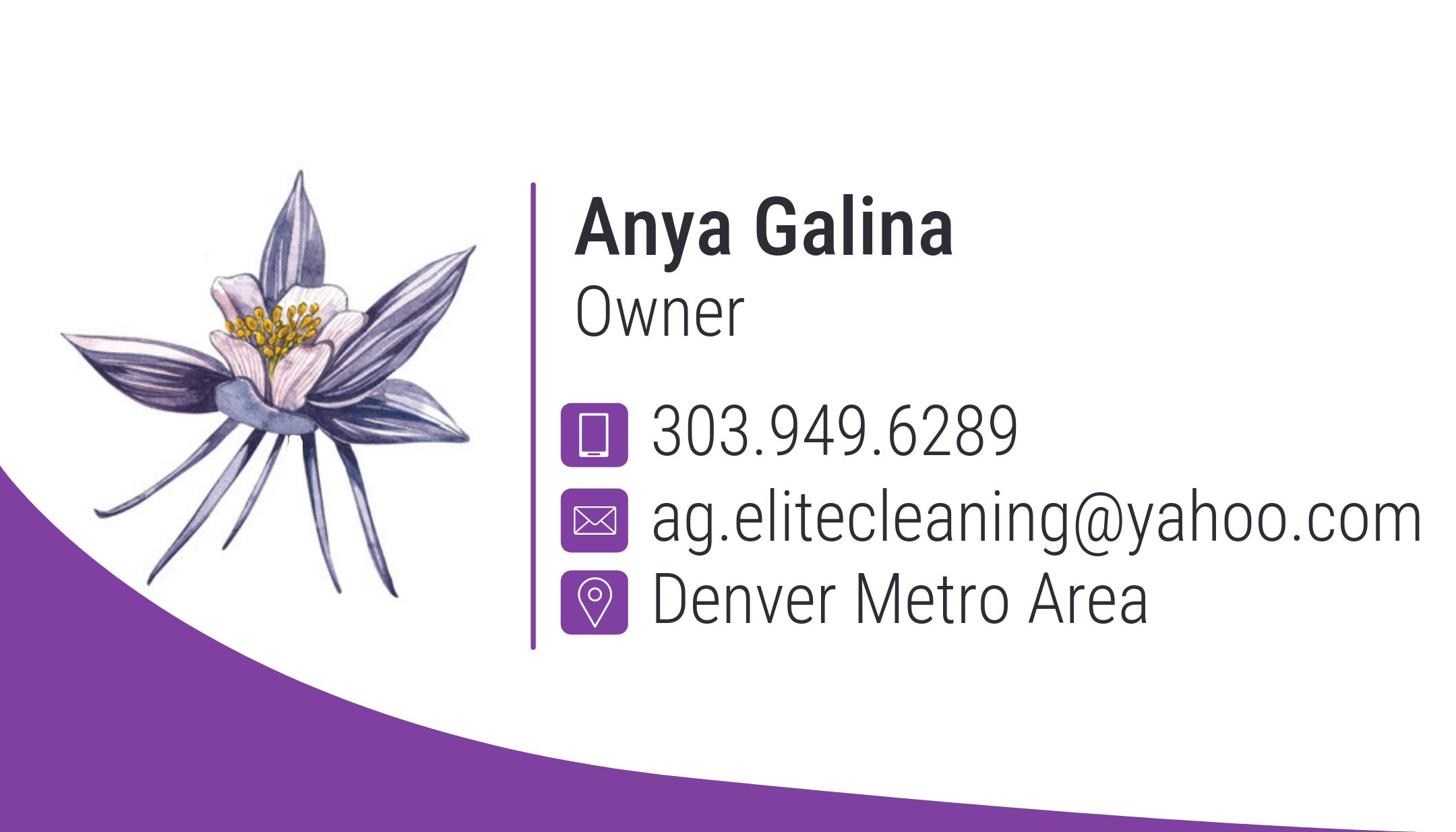 While working on a business card re-design for AG Elite Cleaning Services, a local cleaning business, I created three design variations inspired by their old business card design. The three different flowers were provided by the company. I also re-used their established color palette. The client and I both agreed that the rightmost design was the most successful.