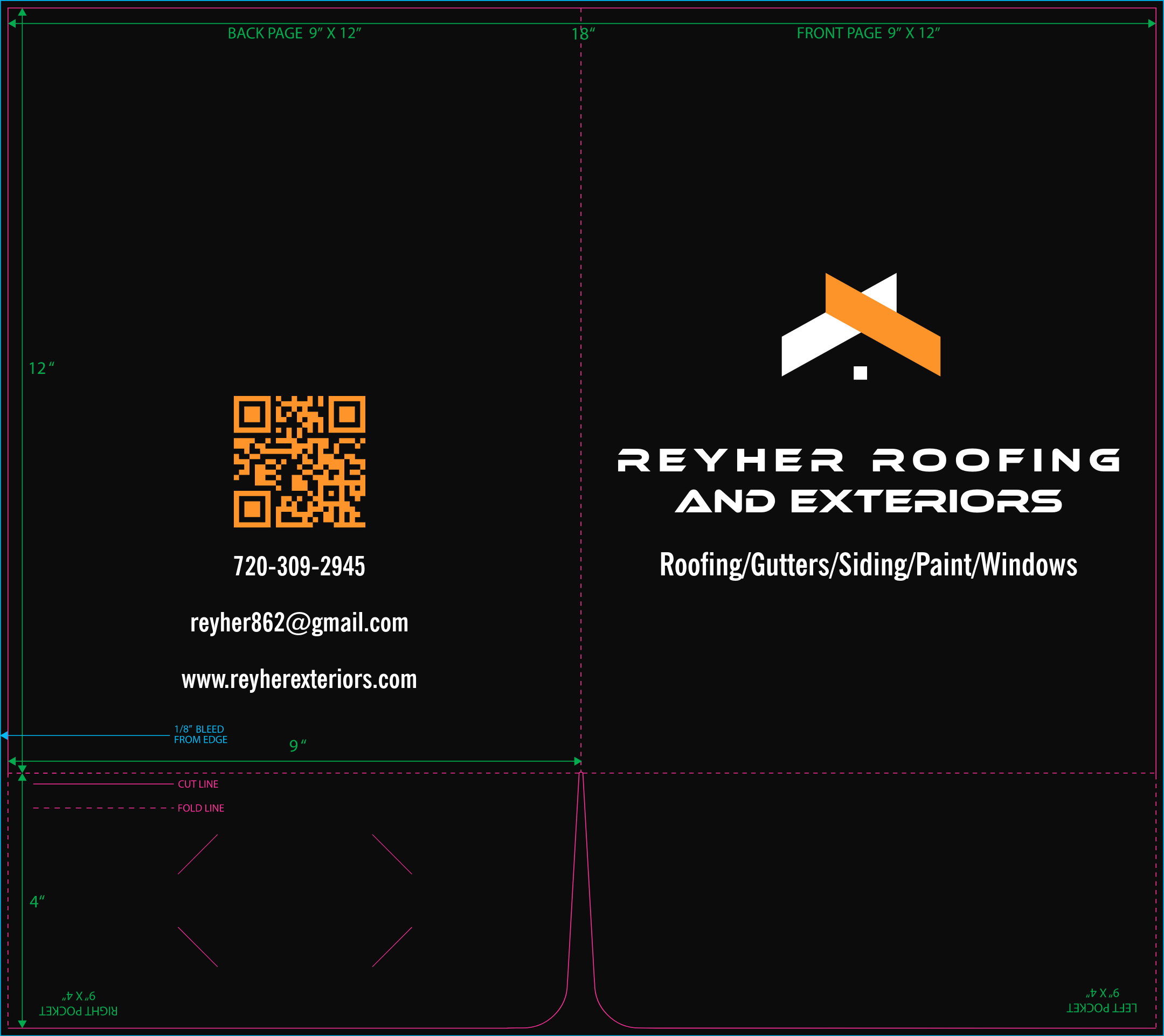 While working as a Freelance Pre-Press and Print Graphic Designer, I was tasked with various print projects, from making small changes to existing files to designing large projects from scratch. Pictured below is a simple design for a folder with business card cutout on the inside right pocket. The client, Reyher Roofing, requested their phone, email, and website on the back of the folder.